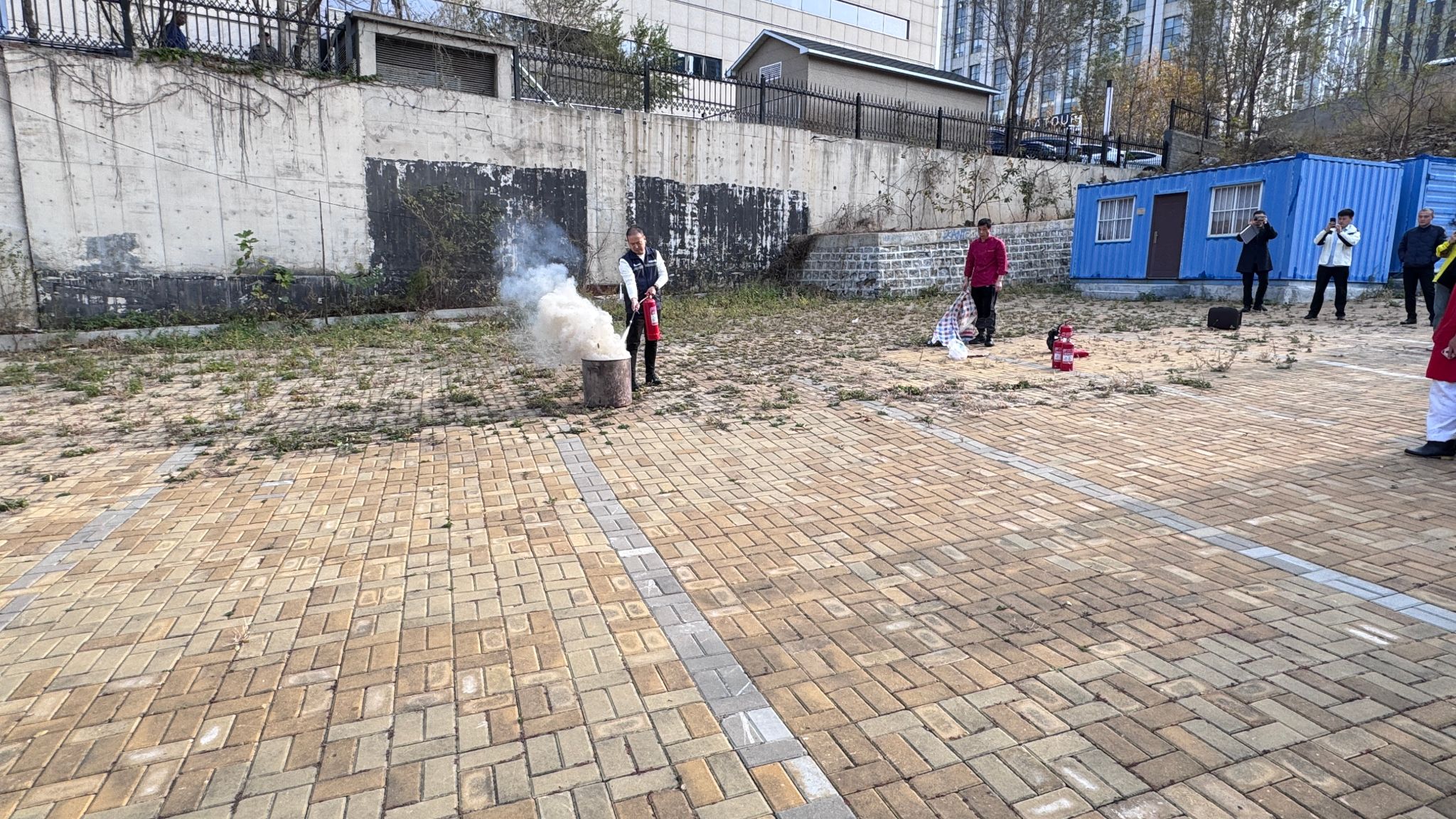 讲座结束以后,夏教官又来到室外空地,现场示范了干粉灭火器和灭火毯的正确使用方法及注意事项,并组织一线员工们进行了实际操作。