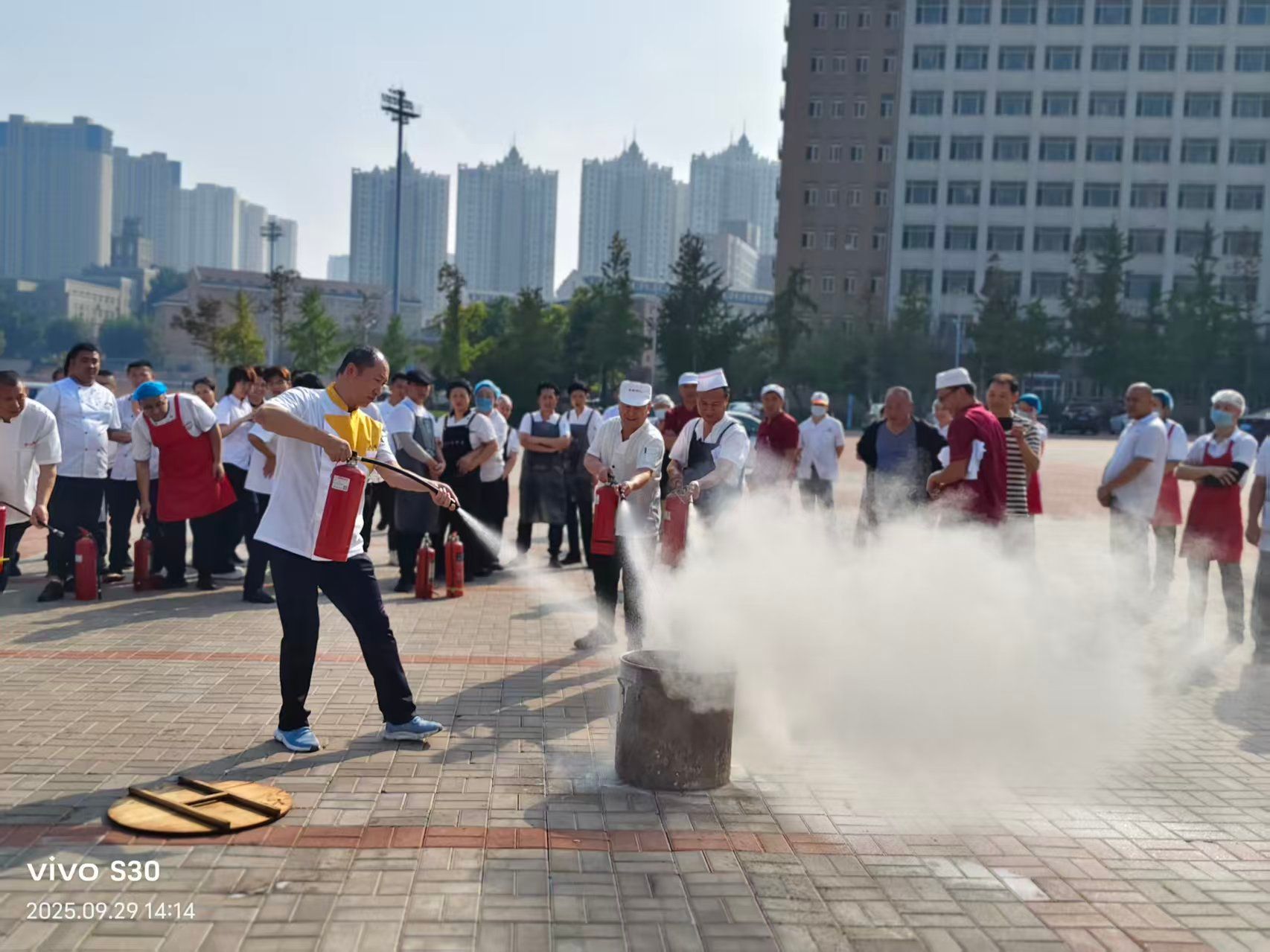 讲座结束后,在教官的指导下,现场开展了油锅灭火专项演练。教官现场演示了水基灭火器、干粉灭火器、灭火毯及灭火盖的正确使用方法和注意事项,并组织一线员工进行了实操练习。